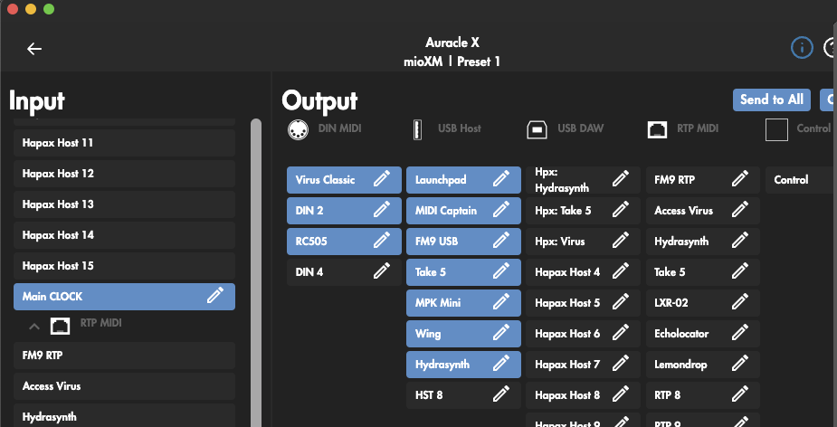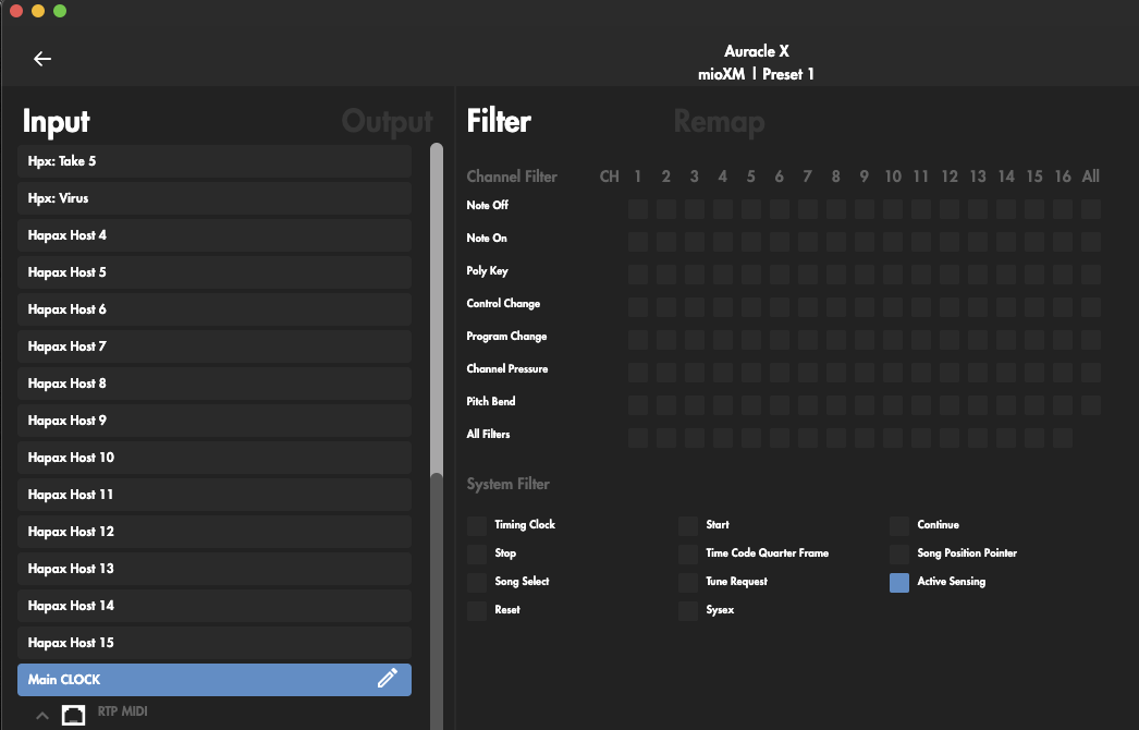 I got my MioXL and its pretty simple to setup. I just want to make sure I have this right - in Auracle, how do you have your filter and remap settings? I just went and set it so my input for the Clock sync DIN (going into a HAPAX din port) has all the channel filter MIDI blocked out (blue) and the system filter is unchecked. I did this for both the input and output, so hopefully that means just timing info is sent through that DIN port now. I then went to the hapax USB and did the opposite, so all the system filter info with sync..etc is marked blue for input and output.