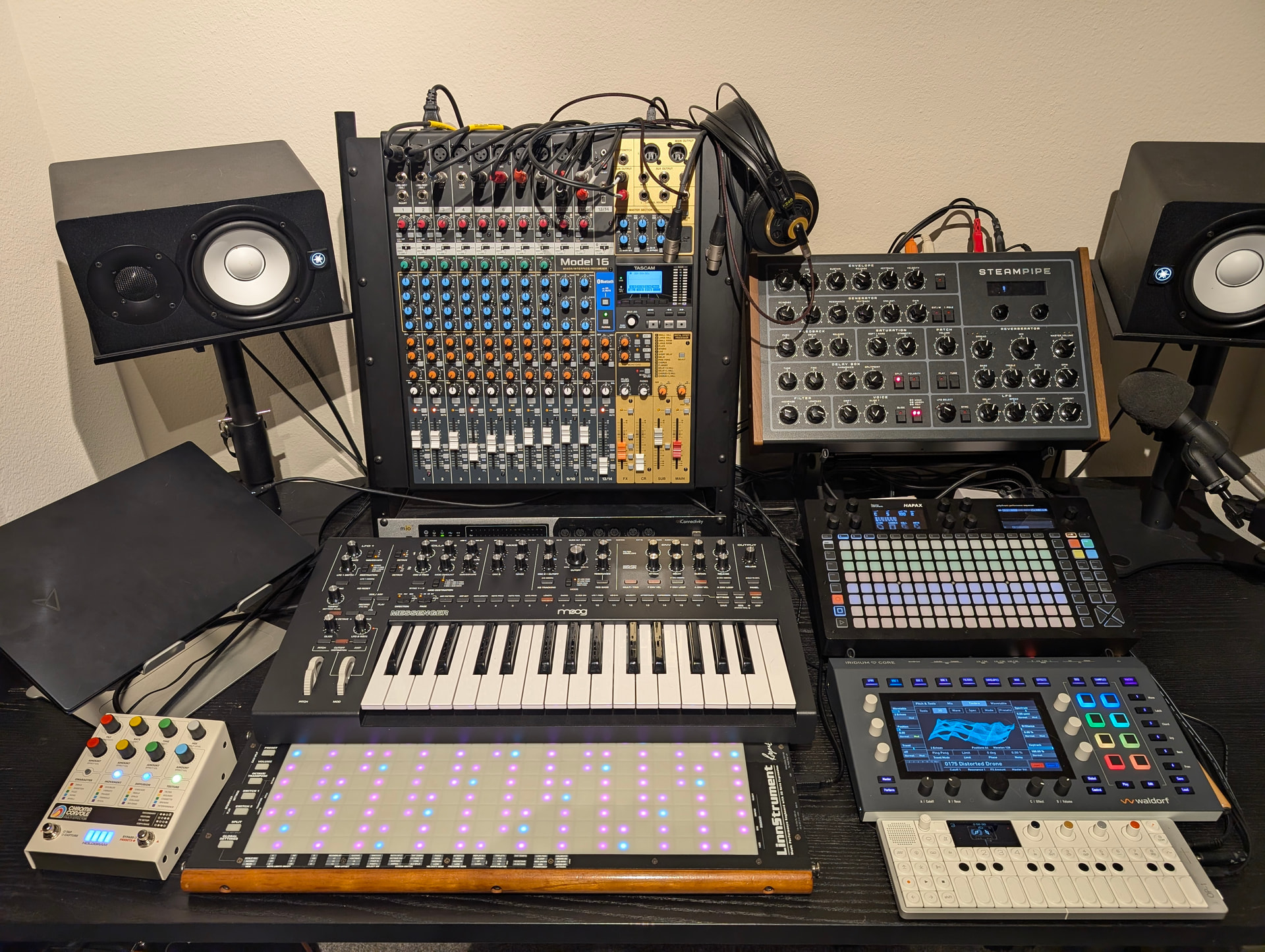 I am using both the USB Host and USB Device ports in this setup. These (plus power) means that there are only 3 cables connected to the Hapax. This gives me 32 independent Midi outputs.