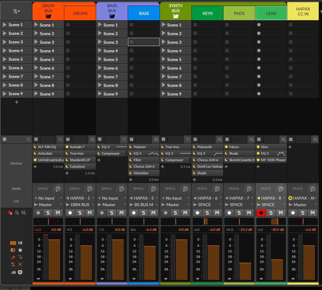 so… youre trying to send cc to bitwig for… what purpose? and a send… in the mixer in bitwig? what kind of send and why do you think you want one? switching tracks on hapax wont arm or do anything in bitwig. youll need to. arm your tracks manually in bitwig. a ‘send’ the way i think you mean, in the bitwig mixer takes an audio signal and sends it to something like a reverb if thats how you set it up. its an alternative to an ‘insert’ where the reverb would be on the individual track. its a way to avoid opening a bunch of reverbs unnecessarily and open only one instead but send audio to it from many tracks at once..